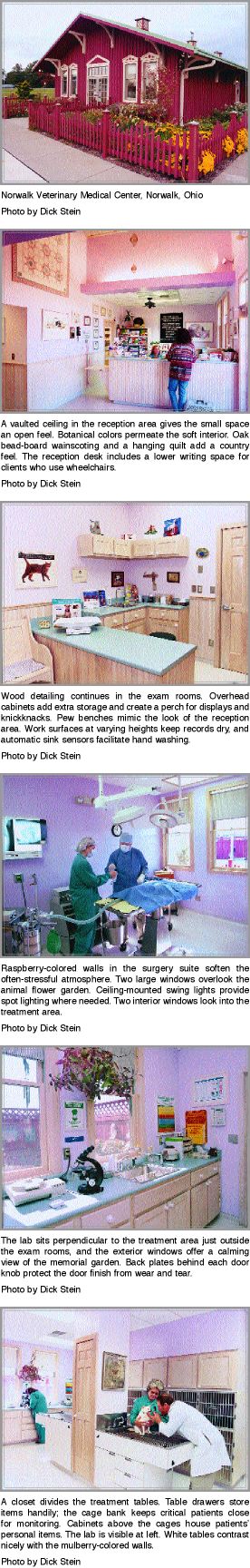 | Banking on charm By Carolyn Chapman, special assignments editor Studying Norwalk Veterinary Medical Center in Norwalk, Ohio, from a distance is like watching clouds on a summer day. Some people see a barn; others see a train depot. And everyone is right. "We wanted to build a charming facility, inspired by old barns and train depots, that evoked the veterinary profession's farm roots," owner Dr. Ronald G. Hendrikson says. This vision led him to create an award-winning floor plan in just 2,736 square feet. In bestowing the Best Small Hospital award on the clinic, one judge of Veterinary Economics' 2001 Hospital Design Competition praised the "perfect exam rooms." Another judge said, "This hospital exudes charm with its gardens and efficient floor plan." And Mark Hafen, AIA, of Gates Hafen Cochrane Architects PC in Boulder, Colo., remarks that his challenge was packing so much into a small space while heeding the budget. "It's sometimes more cost-effective to build bigger," he says. But he's pleased with the overall charm of the completed project. "It packs a lot of character into such a small hospital," he says. Unforeseen plans Dr. Hendrikson bought the practice, which was housed in a 600-square-foot converted garage, from a retiring veterinarian in 1992. He only leased the building, and the wiring was so outdated that his team had to turn off the window air-conditioning units to take radiographs. Just weeks after buying the practice, the 1983 Iowa State University graduate headed to Veterinary Economics' Hospital Design Conference, determined to build a new facility. There he met Hafen. While Hafen created the design, Dr. Hendrikson scouted land and found a highly visible corner lot just outside the city. Next, Dr. Hendrikson focused on financing. Local banks worried because he'd only owned the practice a few months. "They wanted a three-year track record of the practice under my leadership," he says. So swallowing his pride, he asked a friend who owned a business to cosign for the loan--which the bank approved--and loan him an additional $40,000. "Asking for help was the hardest thing I've ever had to do," he says. "But I refused to give up my dream." In 1995, the bank approved a five-year loan, and he paid off everything last year--including the $40,000 loan from his friend. To cut costs, Dr. Hendrikson only paid Hafen to draw plans and relied on local contractors to oversee and build the hospital. Now he regrets not having Hafen visit the site. "The project would've gone much smoother with him noticing things we didn't catch," Dr. Hendrikson says. For instance, Dr. Hendrikson discovered after completion that the building sat six inches below the design grade. Regrading fixed the water drainage problem and added an attractive rolling look to the property, he says. Creating farm appeal The exterior design, with its roof cupolas, dog weather vane, window detailing, board-and-batten siding, and oversized roof brackets, reminds people of a simpler time. To conserve resources, all siding is second-cutting native poplar from an Amish sawmill. A rail-pattern fence divides "exterior rooms" that Mrs. Hendrikson created. One room houses a Japanese memorial garden with a waterfall and a lantern resting on an urn. Another fenced garden features plants with animal names, and a topiary shaped like a dog stands sentinel over the next outdoor room--the exercise yard. Inside, the old-fashioned feel continues in the reception area with church-pew seating, hanging quilts, and bead-board oak wainscoting--which Amish friends designed and built. The flower garden inspired the raspberry and mulberry interior colors. A cathedral ceiling lends an open feel, and two oversized exam rooms enhance comfort. Southern windows let light into the exam rooms and the lab, surgery, and treatment areas. A country kitchen--located at the east end of the office/library--adds to the charm. Here, staff members gather around a large table for meetings. Hafen says many people consider this room oversized for such a small plan, but he defends it as a quiet gathering place for the team. "The kitchen is one of two multipurpose rooms in the hospital, and these flexible areas let us make the most of the floor space," Hafen says. The other multipurpose room is a ward/bathing/food-prep area. In the back, isolation occupies the northeast corner near the wards and runs. Two environmental zones keep the clinic comfortable. Dr. Hendrikson chose a seamless vinyl floor with a coved base and an additional layer of caulking to protect against odors. The design also minimizes noise in working areas of the practice, which improves productivity. "I didn't realize how hearing barking dogs all day drains you," Dr. Hendrikson says. He saved space by bucking the trend of offering pet owners one-stop shopping. The retail area and kennel serve clients only, and he refers clients to an area groomer. "I built a veterinary hospital, not a grocery store," says Dr. Hendrikson. "And our plan is proof that you can practice high-quality medicine in a small space. " Carolyn Chapman, a former Veterinary Economics associate editor, is a freelance writer in Liberty, Mo. April 2001 Veterinary Economics |